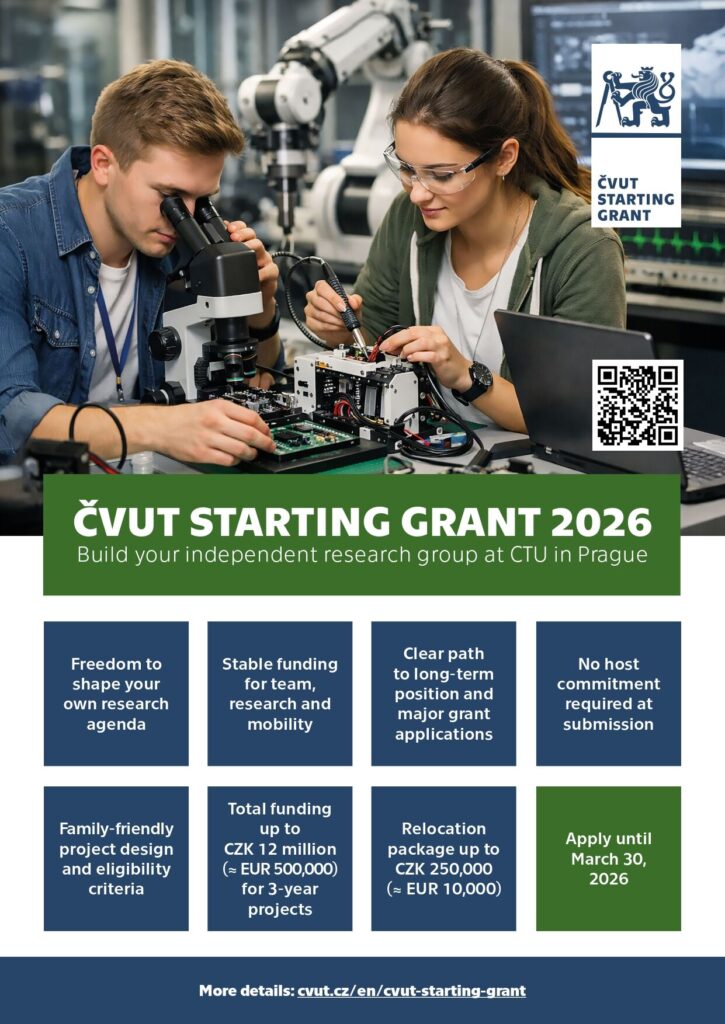 The ČVUT Starting Grant (StG) is a competitive scheme for excellent early-career researchers with substantial international experience who want to establish an independent research group at the Czech Technical University in Prague (CTU). It is open to researchers currently at CTU as well as to researchers from other institutions in the Czech Republic and abroad.